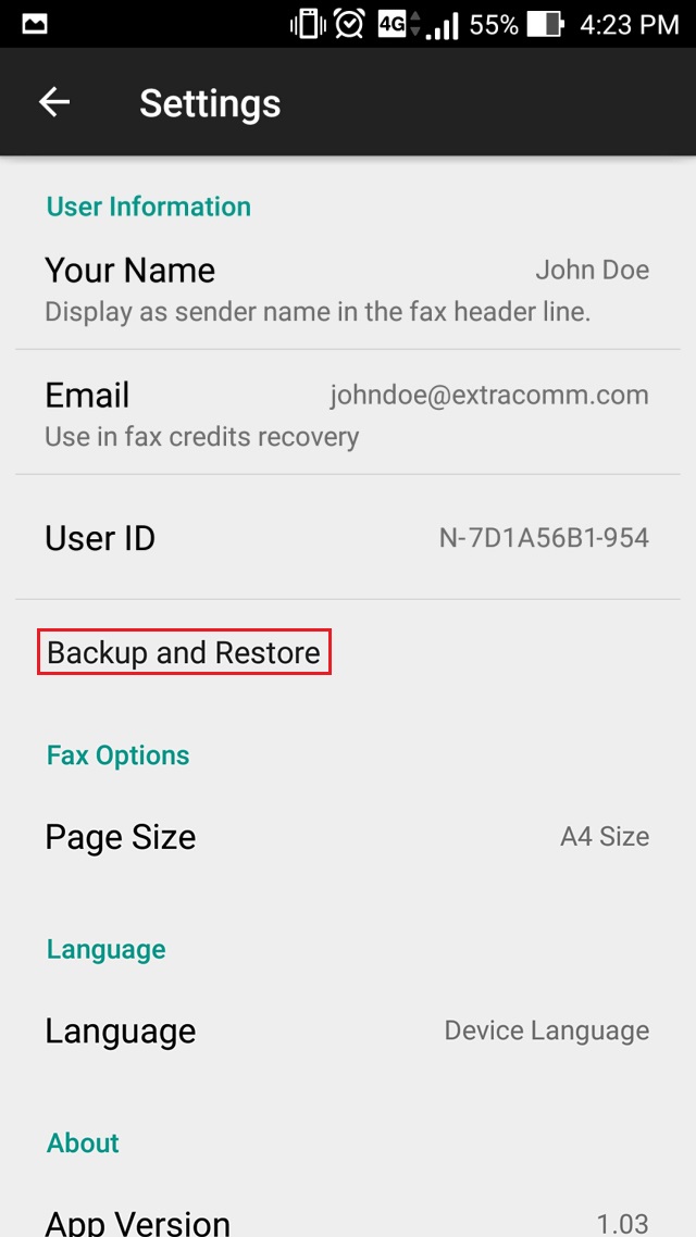 (Diese Funktion ist momentan nur in der Android-Version verfügbar)Mit der Funktion „Sichern und Wiederherstellen“ können Sie Ihre Snapfax-Daten auf Google Drive sichern, sodass Sie die Daten wiederherstellen können, falls Sie das Handy zurücksetzen oder auf ein neues Handy umsteigen