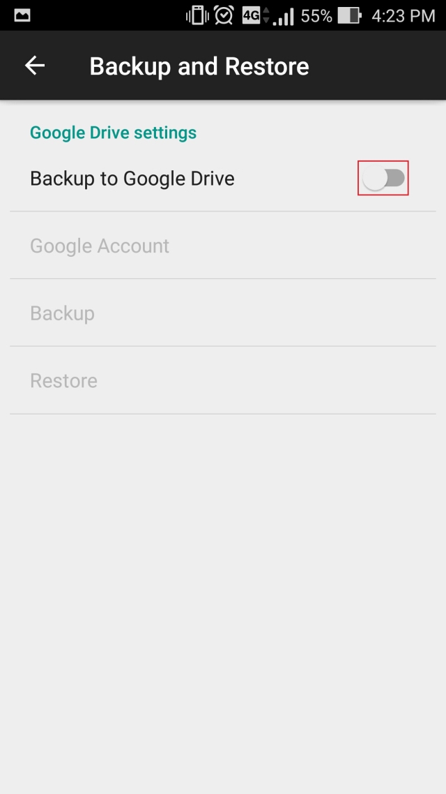 Wählen Sie auf der Seite „Sichern und Wiederherstellen“ die Option „Auf Google Drive sichern“.
