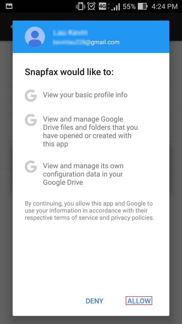 Drücken Sie auf „Erlauben“, um die von Snapfax benötigten Berechtigungen zu erteilen.